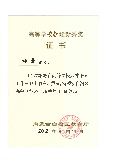教学教改方面荣获各类奖项13项。主要包括:2012年内蒙古自治区第二届高等学校教坛新秀奖。2012年度包头市优秀教师。2005年beat365官方网站第一届“教学优秀奖”,2009年beat365官方网站第二届“教学优秀奖”,2011年beat365官方网站第三届“教学优秀奖”。2006年校级教学成果奖一等奖1项,2009年校级教学成果奖二等奖2项,2015年校级教学成果奖二等奖1项。