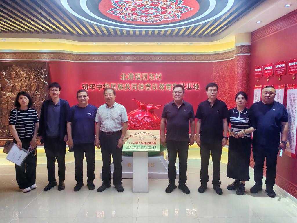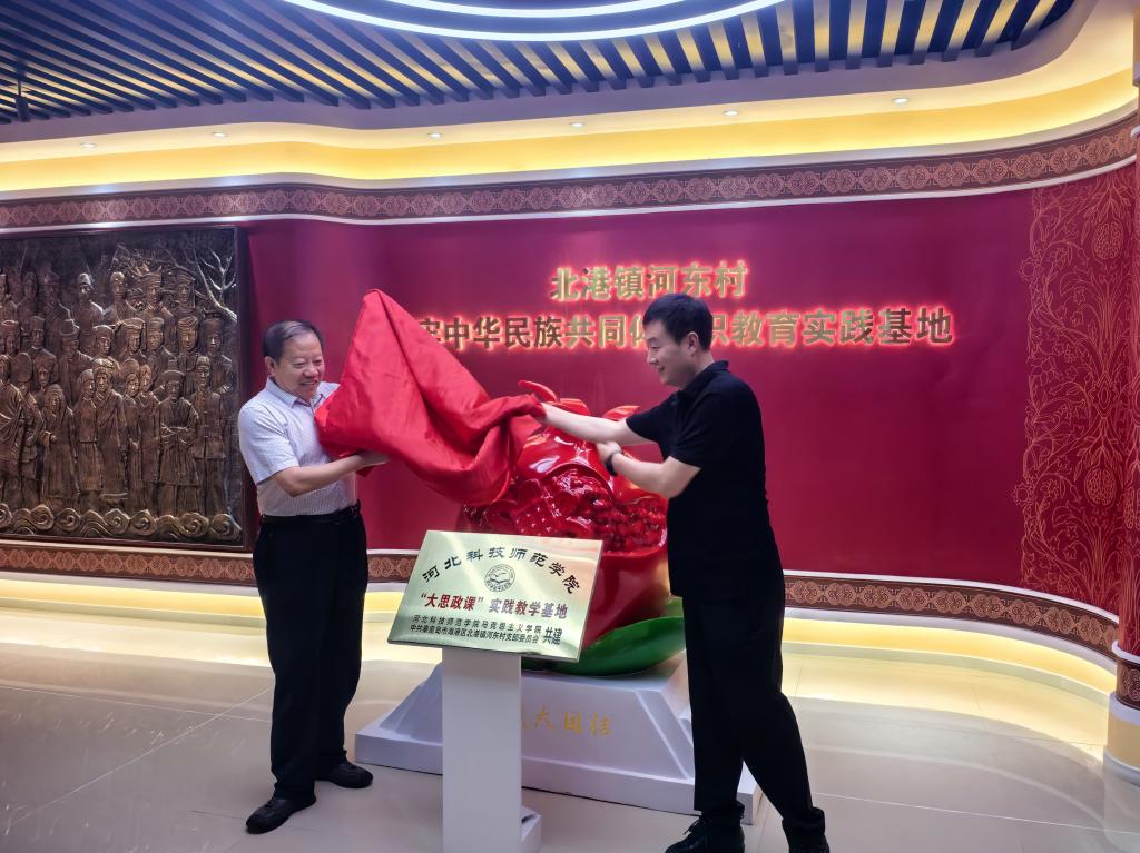 在河东村铸牢中华民族共同体意识教育实践基地,马克主义学院党委书记郭立昌与北港镇党委书记王忠良共同为河北科技师范学院“大思政课”实践教学基地揭牌。随后,大家通过实地参观,接受中华民族共同体意识教育。该基地通过“筑牢理论基石”“树立民族史观”等5个维度,呈现了中华民族交往交流交融的历史脉络;互动体验室融合了民族元素与现代设计,通过场景还原、实物展陈等方式,展现党的民族工作历程与新时代民族团结进步成果。
