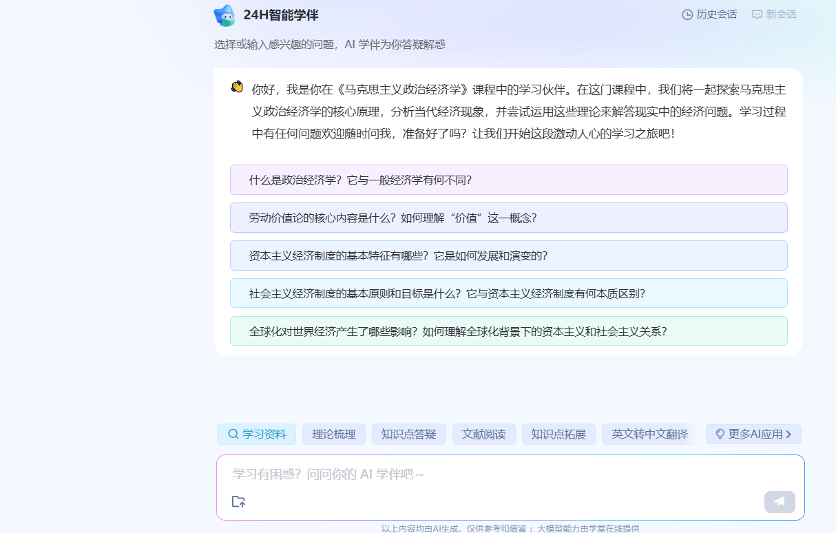 课程设有24H智能学伴,支持学生围绕知识点讲解、前后知识关联及精准资源推荐等需求进行智能对话,实现随问随答。
