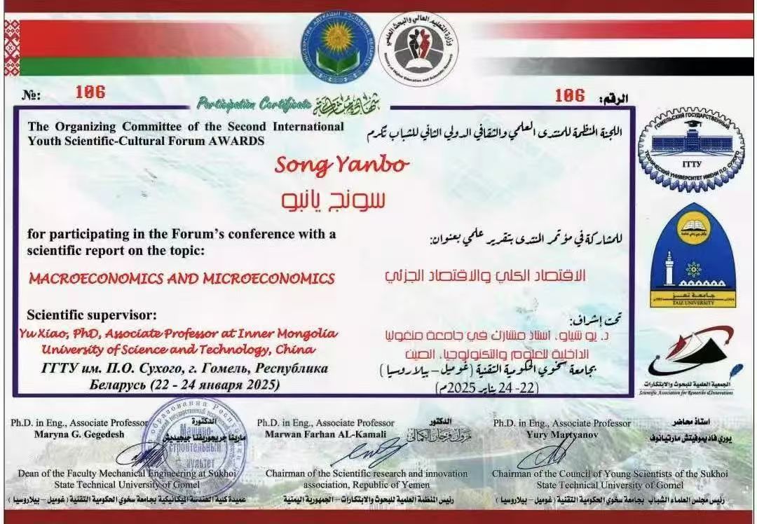 近日,第二届青年科学文化论坛在白俄罗斯戈梅利国立技术大学举行。beat3652024级国际经济与贸易专业学生宋彦博参加活动,其撰写报告“MACROECONOMICS AND MICROECONOMICS”获第二届国际青年科学文化论坛组织委员会颁发的优秀论文证书。