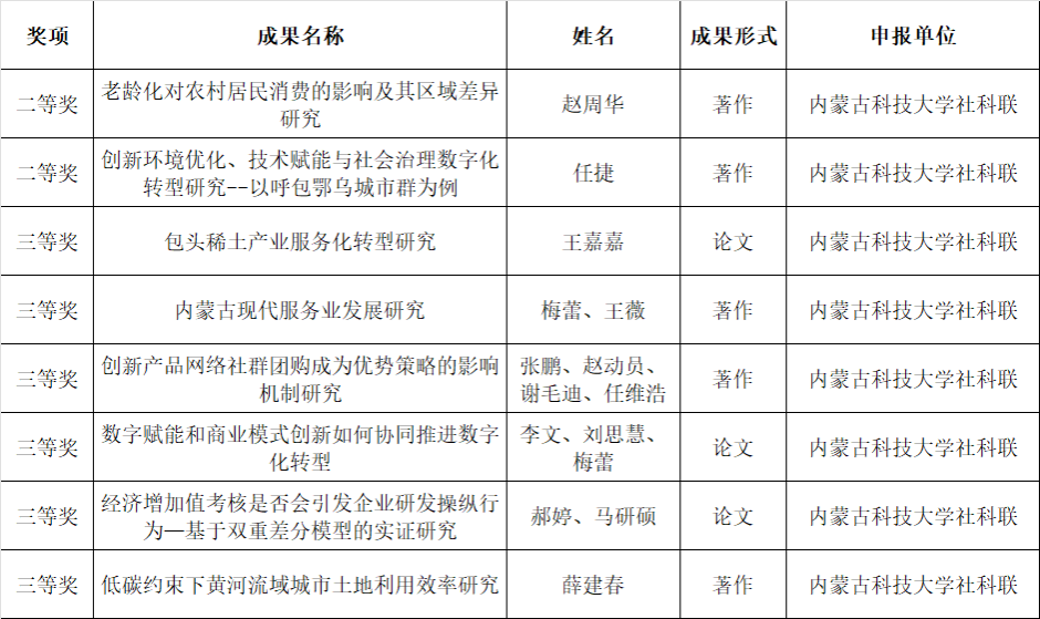 近日,内蒙古自治区社会科学界联合会发布《关于第十一届内蒙古自治区哲学社会科学奖评选结果的公示》,beat365教师8项科研成果获奖,其中二等奖2项、三等奖6项,创近年最好成绩,充分展现了beat365哲学社会科学研究的实力和活力。 此次获奖成果涵盖经济学、管理学、社会学等多个领域,紧扣国家重大战略和自治区、包头市发展需求,既有理论深度,又有实践价值。学院未来将持续推进有组织科研,鼓励跨学科协同攻关,力争产出更多高水平成果,为自治区经济社会发展贡献力量。