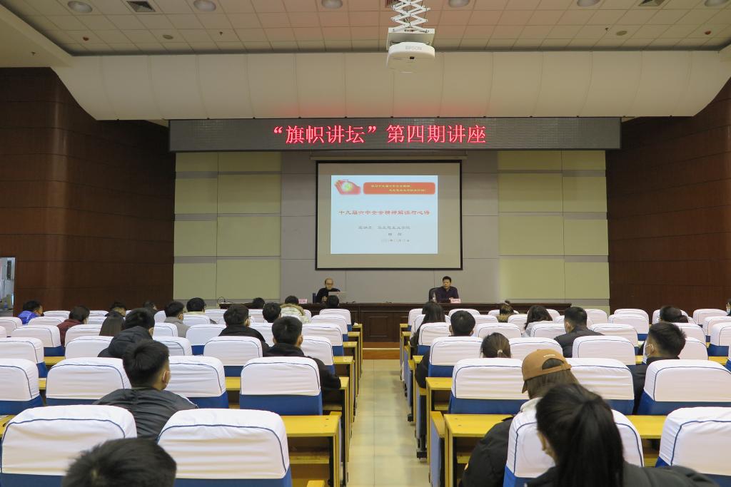 2021年12月16日下午,开云“旗帜讲坛”第四期讲座在秦皇岛校区学术交流中心举办,专题宣讲十九届六中全会精神。kaiyun开云官方网站全体教师、体育与健康学院师生党员及学生入党积极分子等共100余人听取了讲座。