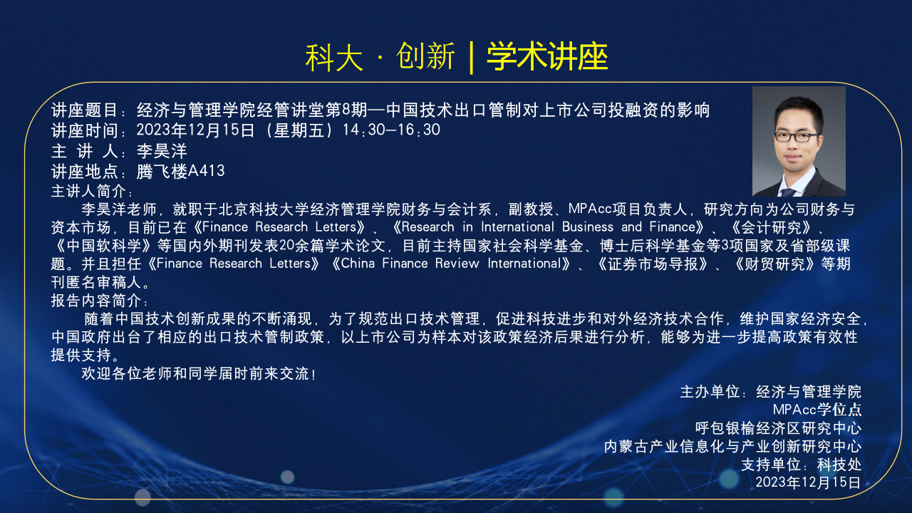 讲座题目:beat365官方网站经管讲堂第8期—中国技术出口管制对上市公司投融资的影响